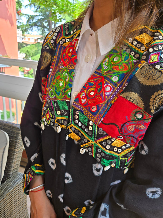 Black Cotton bandhej and patchwork Shrug with hand Embroidery, Long Embroidered fusion wear for Women