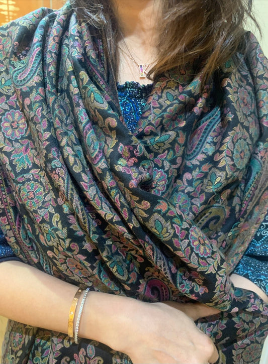 Indian Handmade shawl /fine Zari work black blue gold pashmina/women shawl/All season women shawl/hand woven shawl