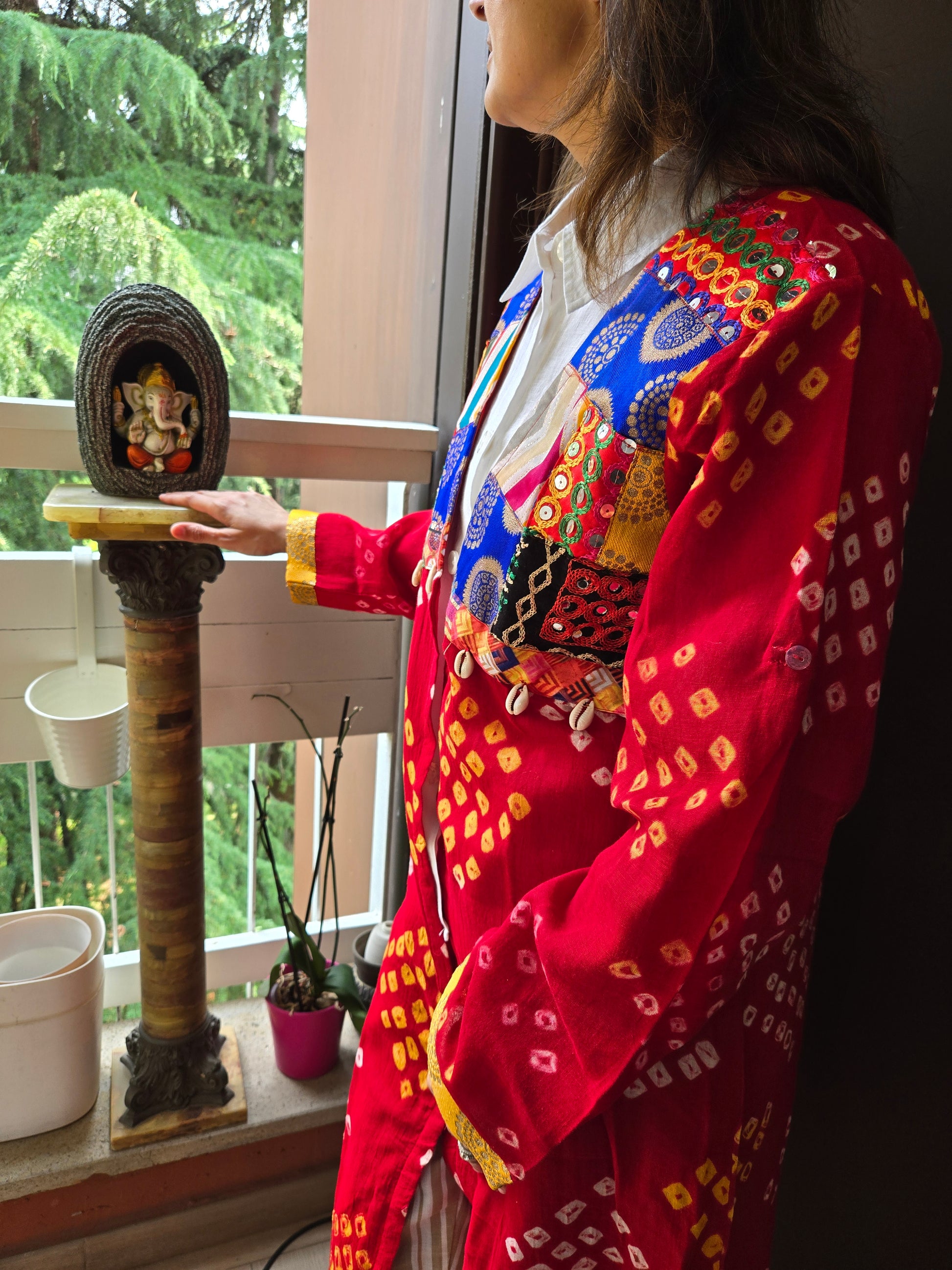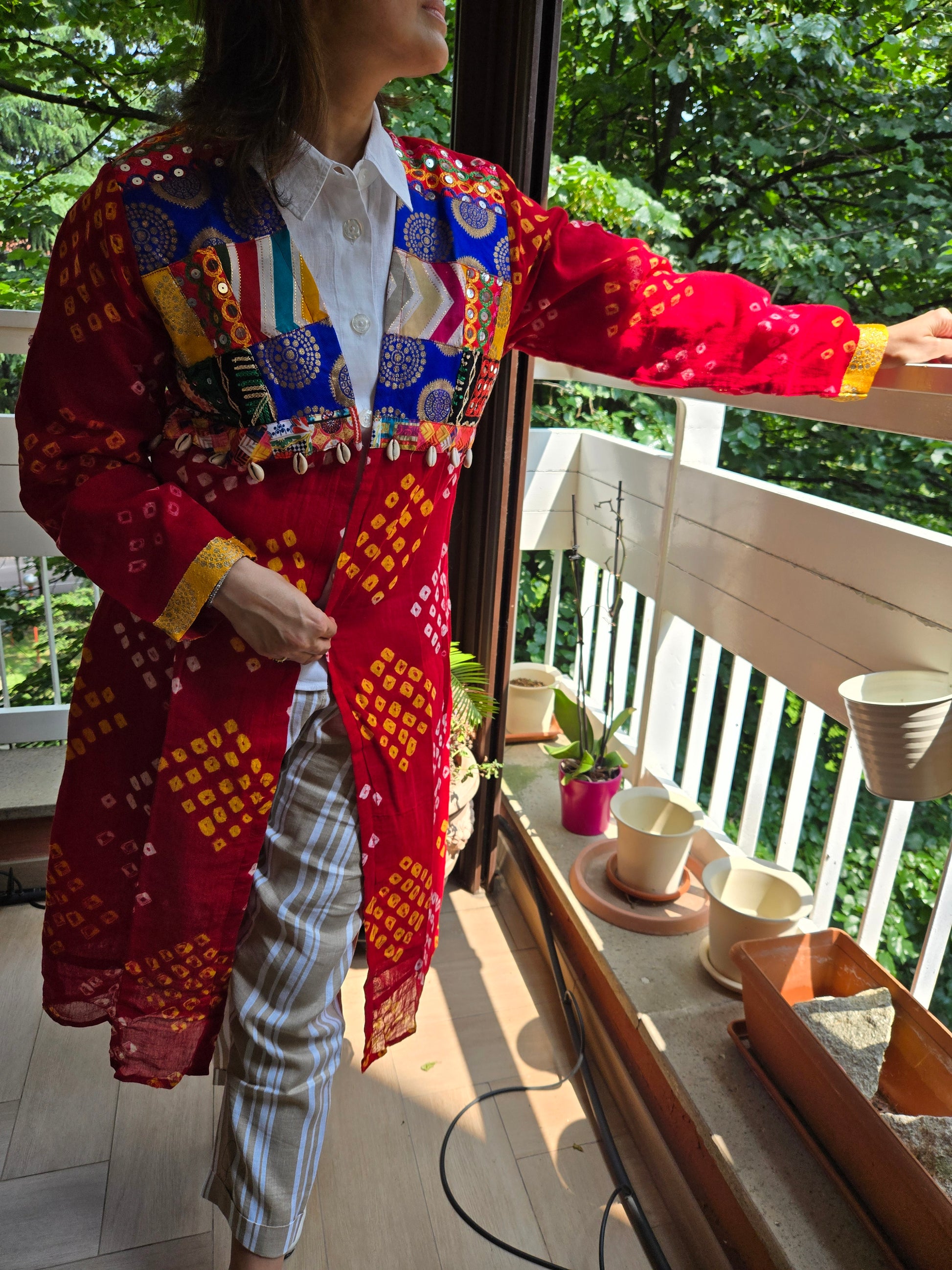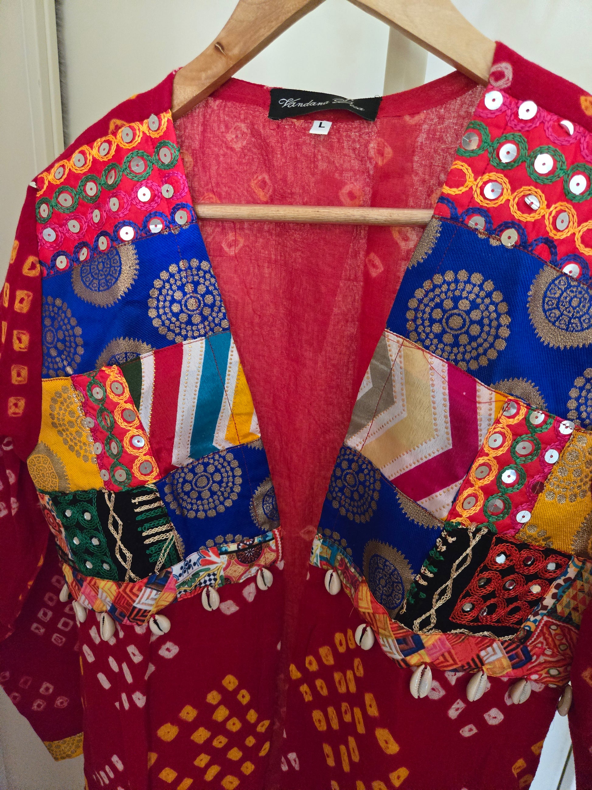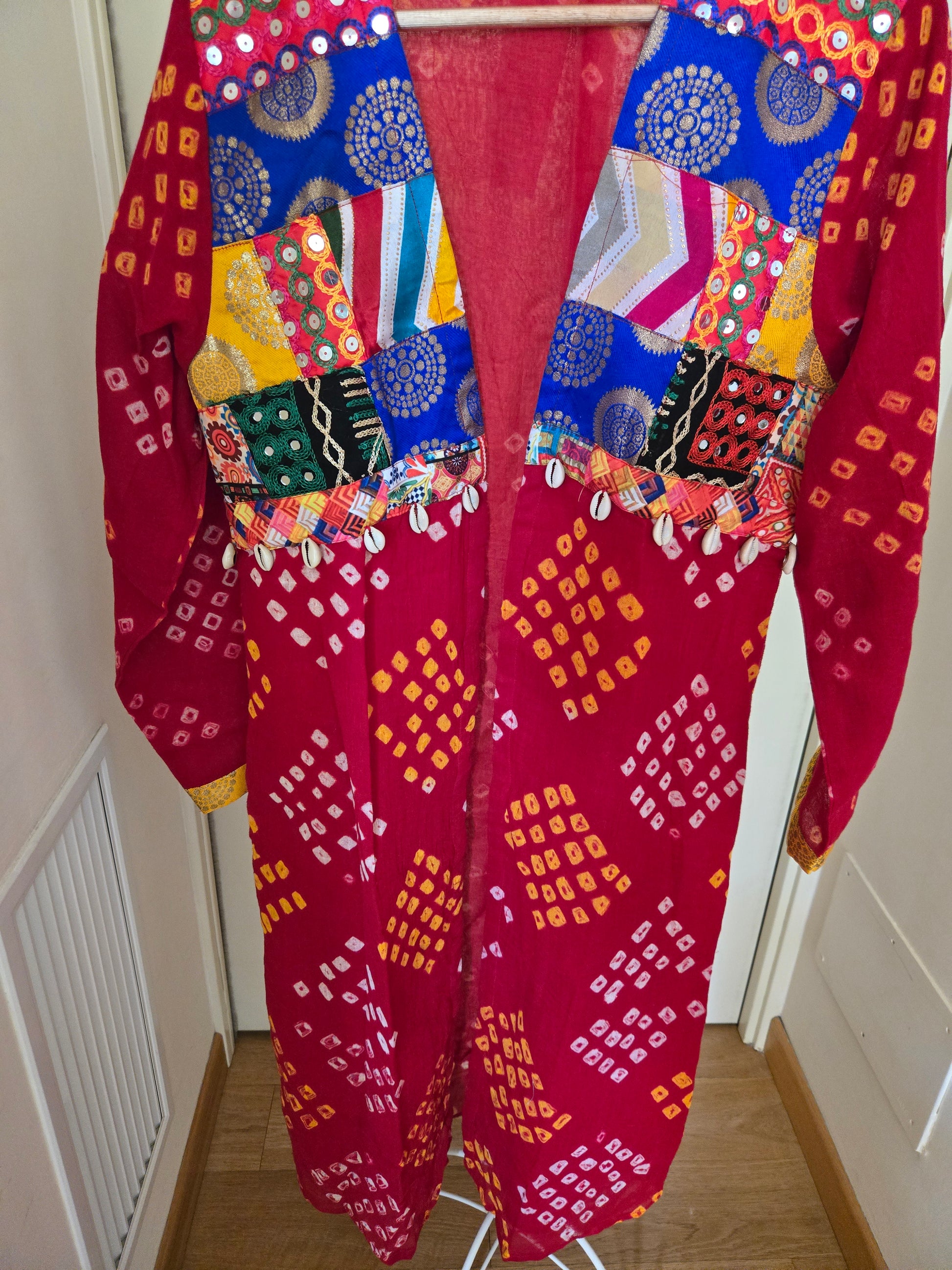 Red Cotton bandhej and patchwork Shrug with hand Embroidery, Long Embroidered fusion wear for Women