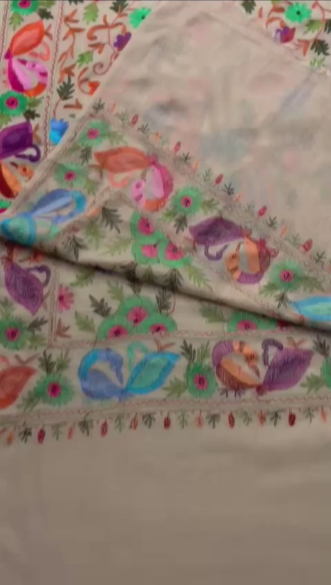 Cashmere Wool Shawl Hand Embroidered Kashmir | Folk ArtWrap | Wedding Gift Heirloom Textile