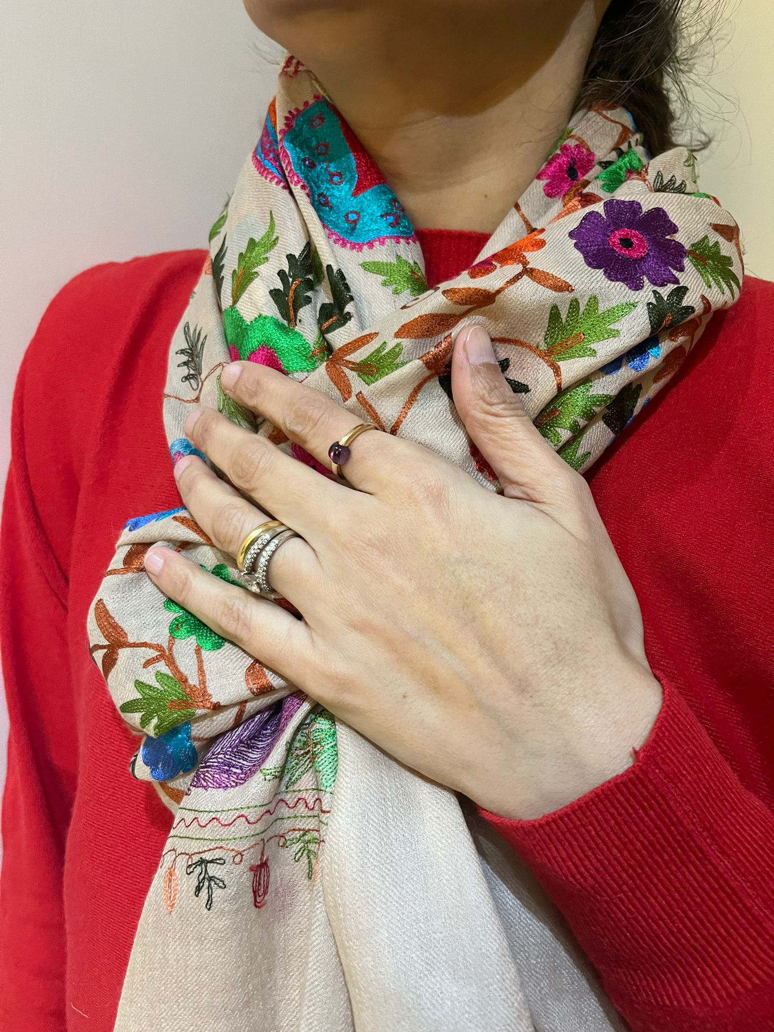 Crafted on a fine, soft cashmere wool base, the shawl offers warmth without heaviness, an elegant drape, and a luxurious feel against the skin. The embroidery is done entirely by hand, using vibrant silk threads and intricate detailing, making each shawl a one-of-a-kind collectible textile.